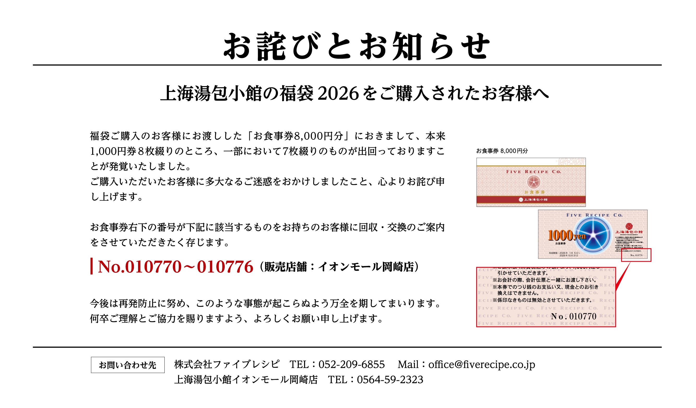 2026福袋ご購入のお客様にお詫びとお知らせ