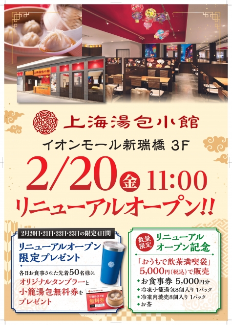 2026年02月12日(木) 最新情報上海湯包小館 新瑞橋店 臨時休業のお知らせ 上海湯包小館 西銀座店は2026年2月12日(木)から、改装リニューアル工事のため休業させていただきます。 リニューアルオープンは2026年2月20日(金)を予定しております。 お客様にはご迷惑をお掛けしますが、ご理解の程よろしくお願いいたします。 リニューアルオープン後は限定プレゼント等、お得な企画が目白押し! お得なこの機会をお見逃しなく!